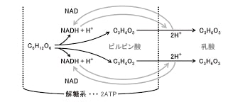 乳酸とは、身体活動に必要なエネルギー(ATP)を作る際に、糖を分解することできる生化学物のことです。短距離走や筋力トレーニングなど、短時間で高強度の運動では乳酸が血中に多く分泌します。以前はこの乳酸が、疲労物質のひとつとして考えられており、運動生理学の分野では、血中乳酸の早期除去に関する多くの研究がなされてきました。しかし、現在では、乳酸は再利用可能な身体エネルギーとの認識がされています。乳酸は酸化基質であり、ミトコンドリアを介在し糖分解の過程でエネルギー源として再利用されます。
