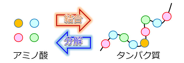 タンパク質は複数のアミノ酸が結合したもので、筋肉、ホルモン、血液などヒトの体を作る原料となります。人の体を作っているタンパク質は、20種類のアミノ酸から構成されており、必須アミノ酸(体内で合成できない)と非必須アミノ酸(体内で合成できる)に分類することができます。この他にも、テアニン、オルニチン、シトルリン、タウリンなどタンパク質を構成しない遊離アミノ酸があります。